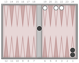 But black rolls sixes. Glorious sixes! In one roll black gets all his checkers off and wins the game. He even wins a gammon. His equity soars from −1.24241 to +2.0, a difference of +3.24241.