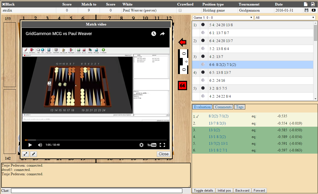 I uploaded the match to Backgammon Studio and linked up the video so now you can watch the video while checking the XG evaluation as the match moves forward: