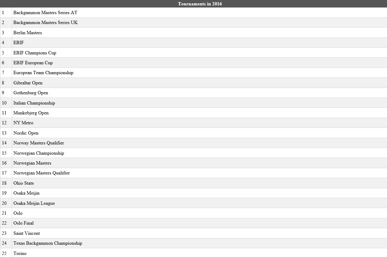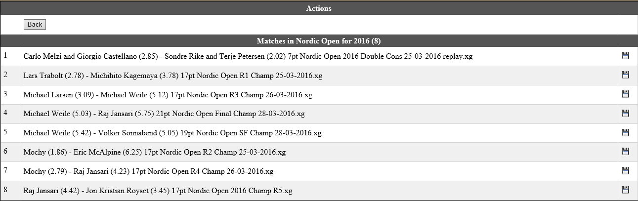 Here you'll see all tournaments from 2016 which has one or more uploaded match. If you click on one of these you'll see all matches for this tournament: