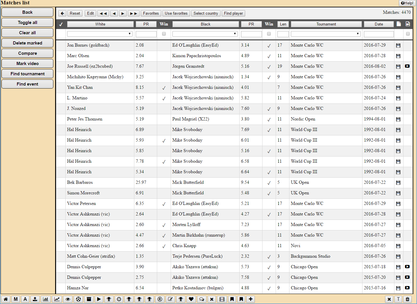 You need to log in to Backgammon Studio and then you can download all 4470 matches if you want. Or you can play them directly from the links I provided.
