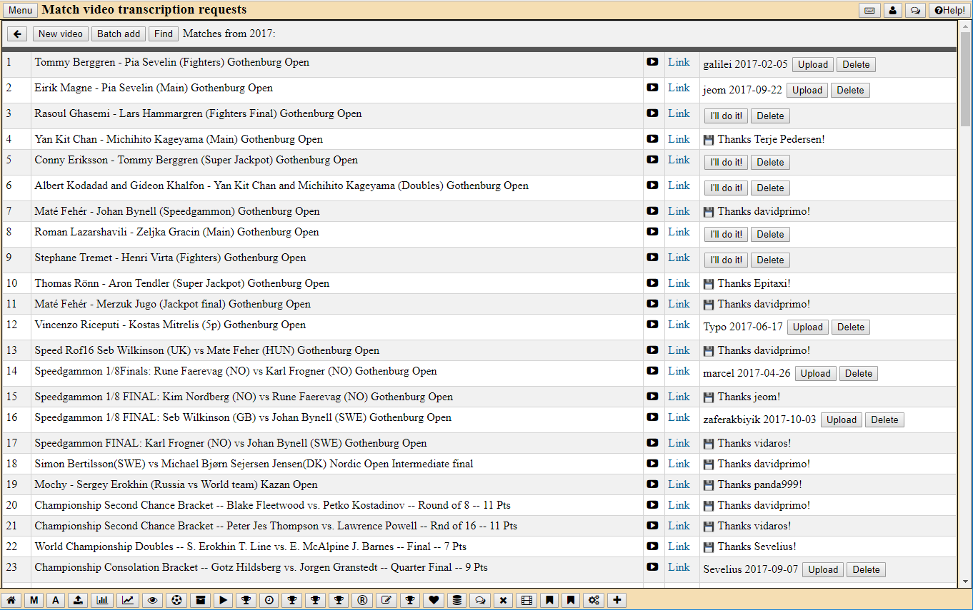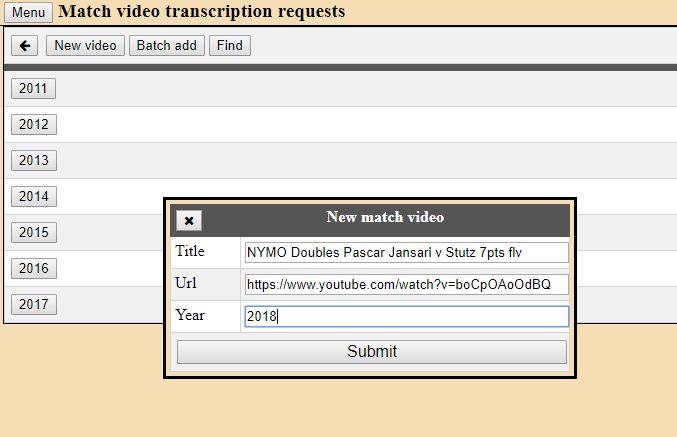 Here you'll see all transcription requests grouped by year. To add a new video click "New video". A dialog opens up. Fill in the details and click submit. I just copy paste the title from the youtube video so it is nice if the title is descriptive and contains year, tournament, players and match length. Any extra info like what event doesn't hurt either.
