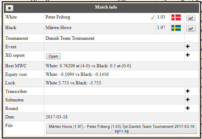 But sharing the match may not have been on the mind of this player when transcribing it and adding it to tens or even hundreds of matches when they decide to share the match may not be a top priority. This is also a reminder that it is nice to include transcriber information into the XG file so this information can be obtained later. XG remembers the 'Transcriber' field between transcriptions so you only have to enter your name once.