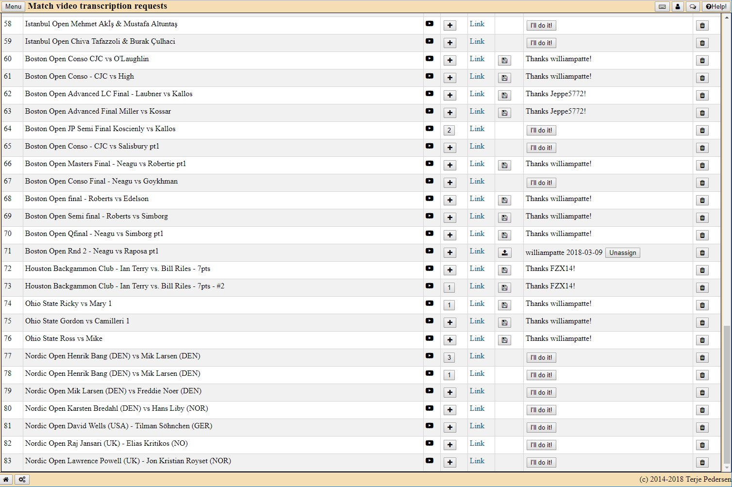 Here you see that some matches have been transcribed with a thank you note to the transcriber. Some matches have a "I'll do it" button. Click on the match you'd like to transcribe and others will know (if they visit this server/section) that you're working on this match and can pick another one instead.