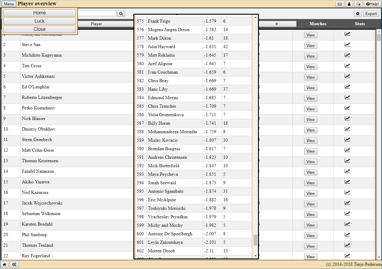 I only have 7 matches from you though (You can fix that!) and the more matches there are in the database the better the numbers get. Mochy has an average luck of -0.002 with 498 matches in the database.