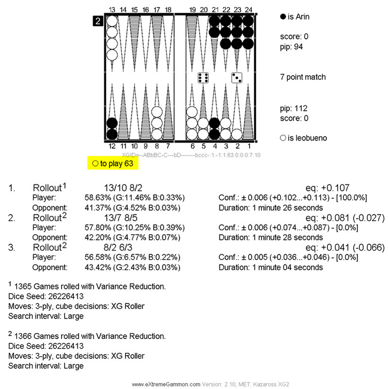 My reference to time being on our side alluded to the opponent likely crunching long before we do. So I anticipated the win would only come from his leaving a blot on the 4 point we could attack. I thought 13/7 8/5 would be the right play, giving us the opportunity to make a 4-prime, cover on the 2 point, or have yet another attacker if the opponent got off the 4 point on the next roll. But I am a donkey, thus this DQ.